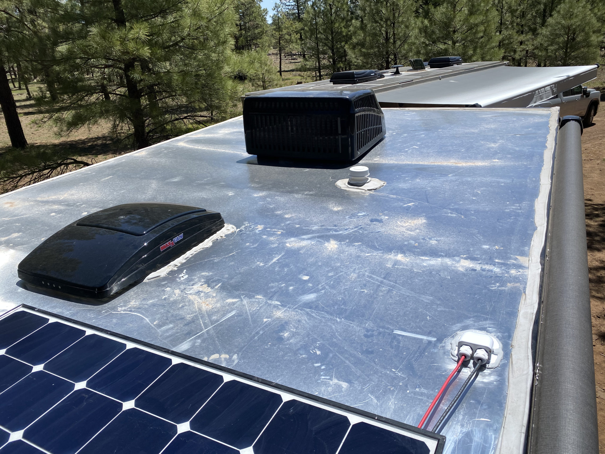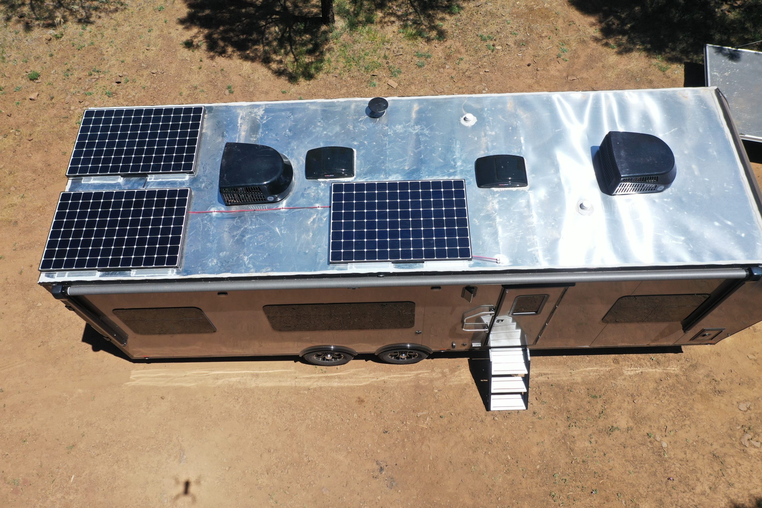 My customer and I planned out the solar/battery/inverter install prior to ordering the trailer. This is very common when the customer wants an electrical solution that is not a cookie cutter solution. The trailer is a 2021 ATC 28′ FB Game Changer Pro, which means it comes with a 1000w Progressive inverter, the generator prep, a Blue Sky PWM charge controller (lowest level of Victron) and most of the electrical components mounted to a modular plate secured to the ceiling. This customer opted to skip the generator upgrade (from the manufacturer) and concentrate on making his trailer solar reliant and keeping it Unplugged!