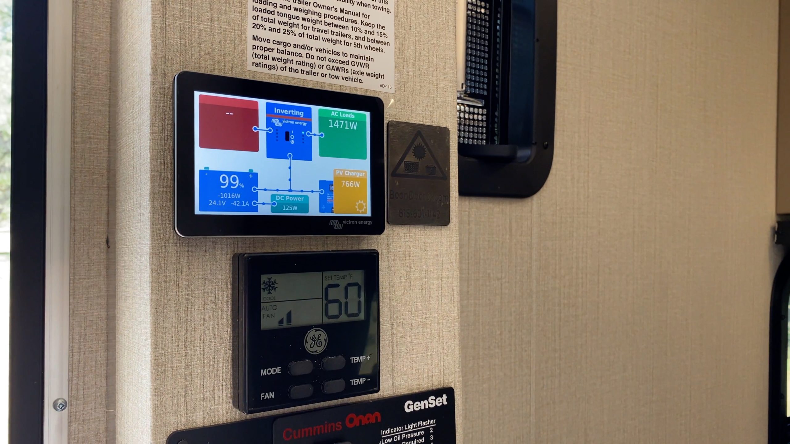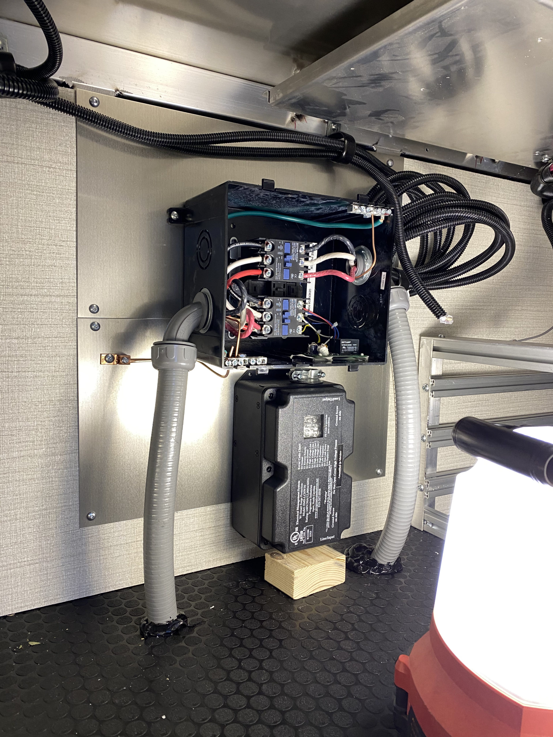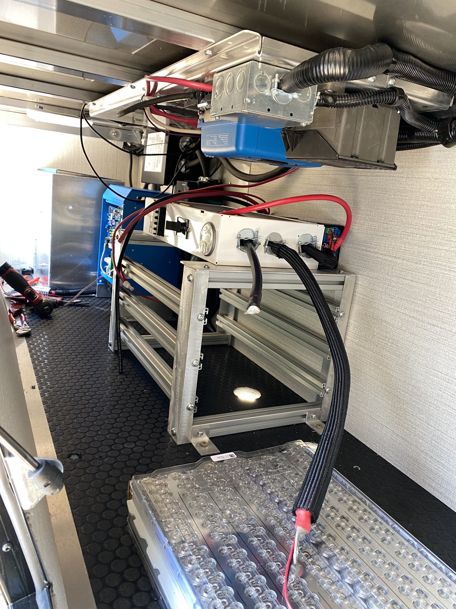 I installed a Victron Mutiplus 3,000 watt hybrid-inverter to run the entire trailer from battery power. Without the onboard generator the 15kWh Tesla battery bank is amazing. This is comparable to 12 BattleBorn batteries that would measure 14″ x 93″ x 8″, just over 9 sqft. The Tesla battery bank can run the trailer with the 12v compressor fridge for 15 days without assistance from the 1050w of solar that I installed on the roof. The Progressive Industries EMW-LCHw50 hard wired surge protector allows for constant protection from faulty shore power situations. The Cerbo GX device orchestrates all of the parts of the system… it will data log, allow remote view and control the electrical systems when connected to the internet. When I removed the stock inverter I added a 15 amp outlet in the front compartment since there was not one on the trailer. This trailer has a 100A @ 24v output for the customer’s use.