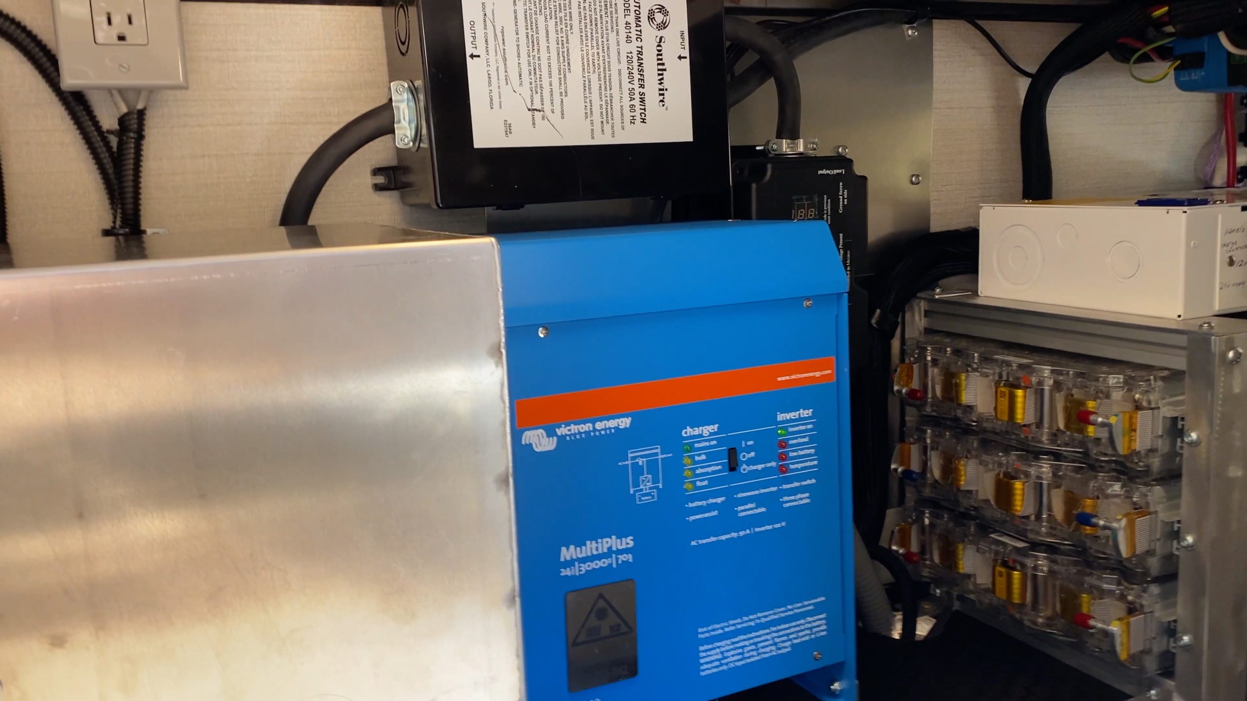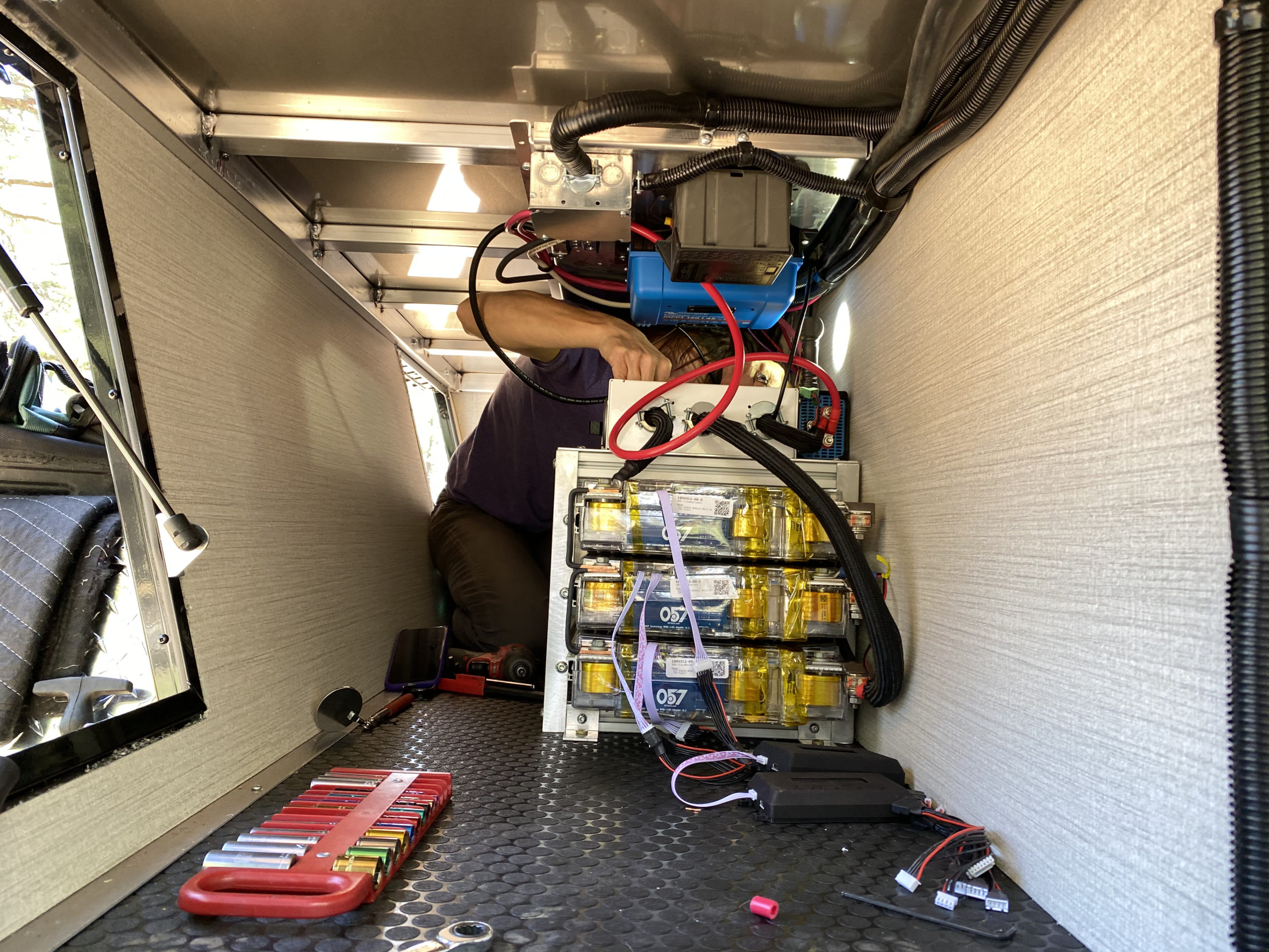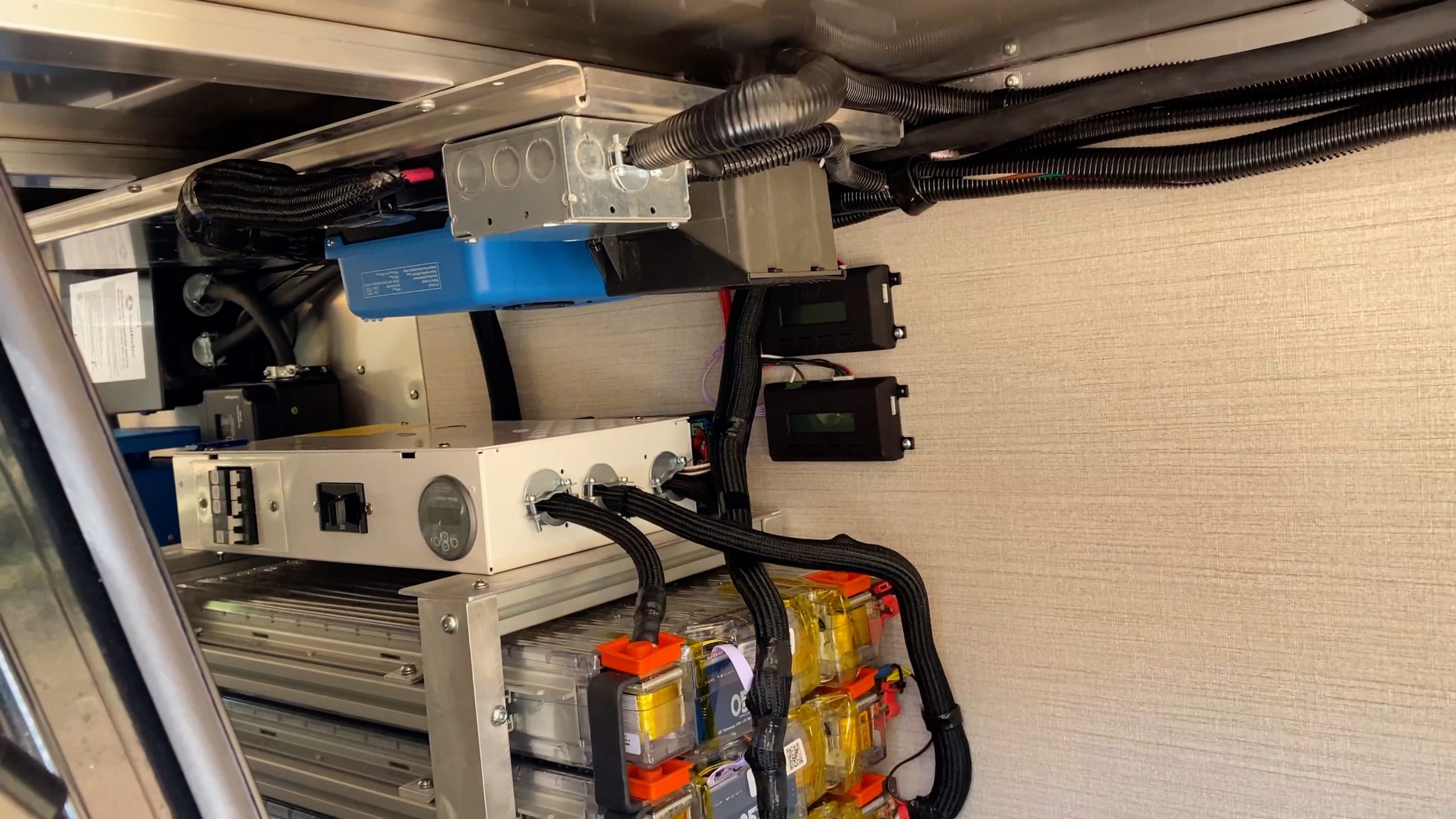 The parts consist of a 15kW battery bank (3-Second Life Tesla Modules), Orion 24 to 12v converter, Victron hybrid 3000 watt inverter, Progressive hard wired surge protector, Cerbo GX with touchscreen, Midnite main disconnect breaker box and 1050 watts of solar on the roof (3-350w Second Life Sunpower solar panels).