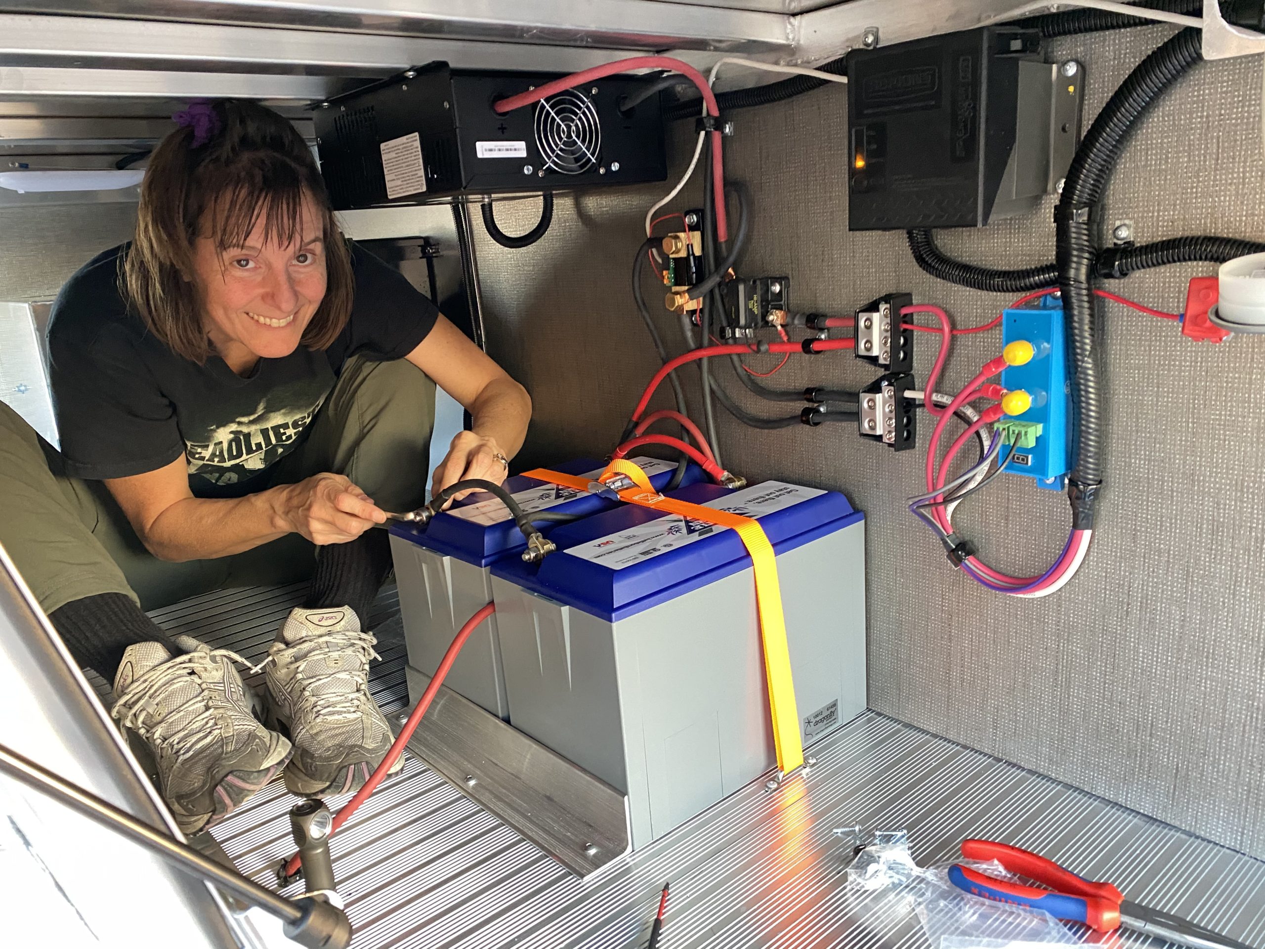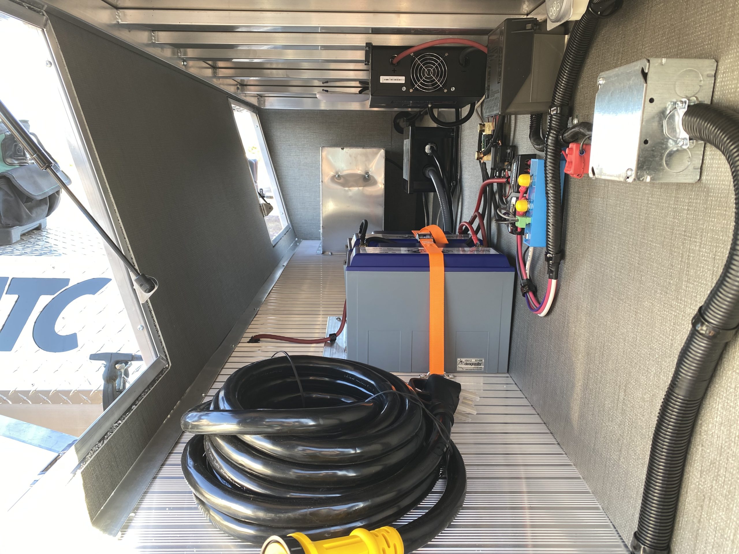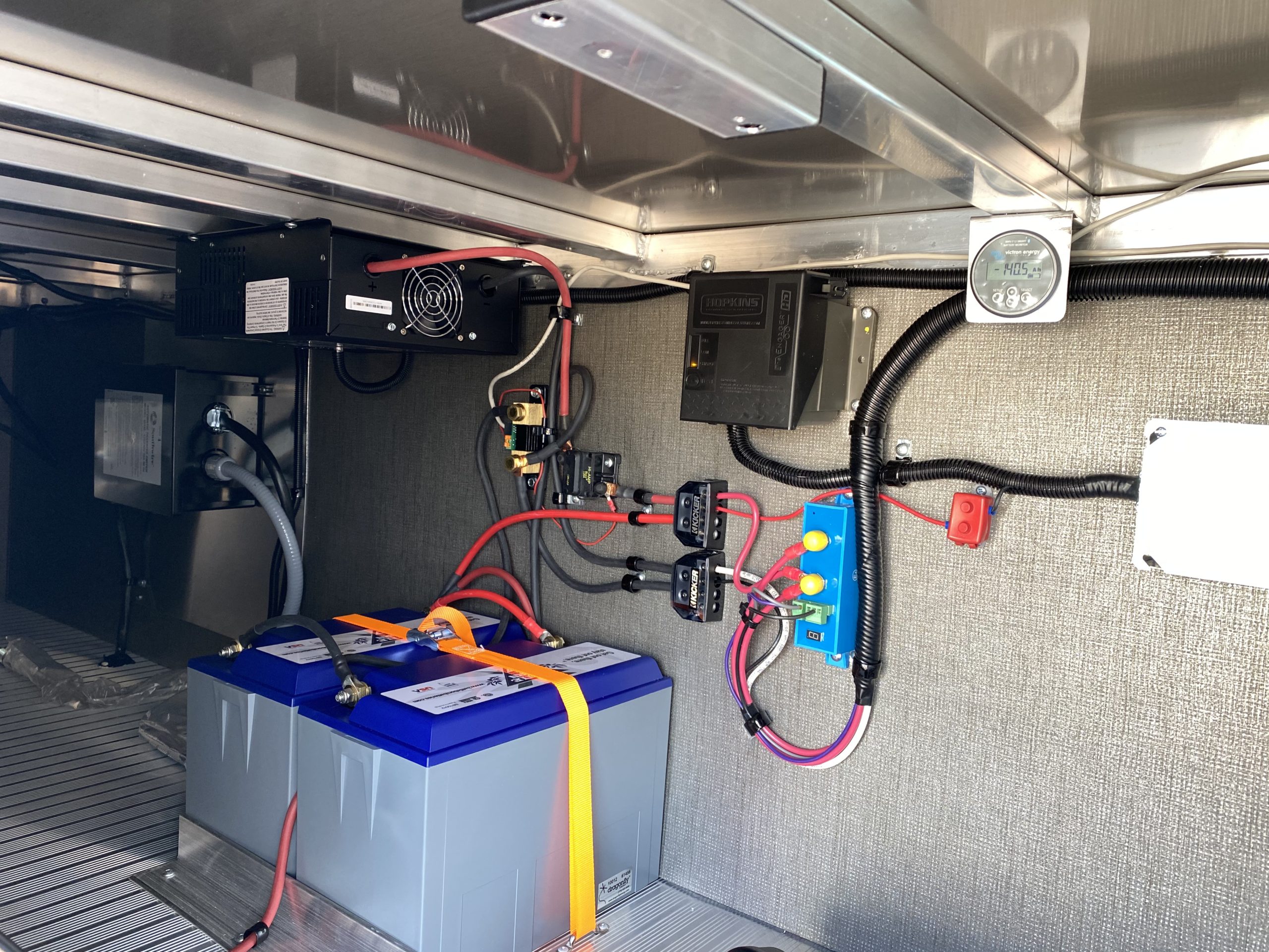 We installed two BattleBorn 100AH batteries and a Victron Smart Shunt to carry the load between shore power/generator run times. This customer does not expect to much boondocking. I expect the 2 Lithium batteries to keep the trailer/fridge running for 2 days without any charging. When charging the batteries with the stock converter will produce 350 DC watts it is important to note that it will take about 8 hours of charge time to bring batteries from empty to full. This will be the same on shore or generator power.