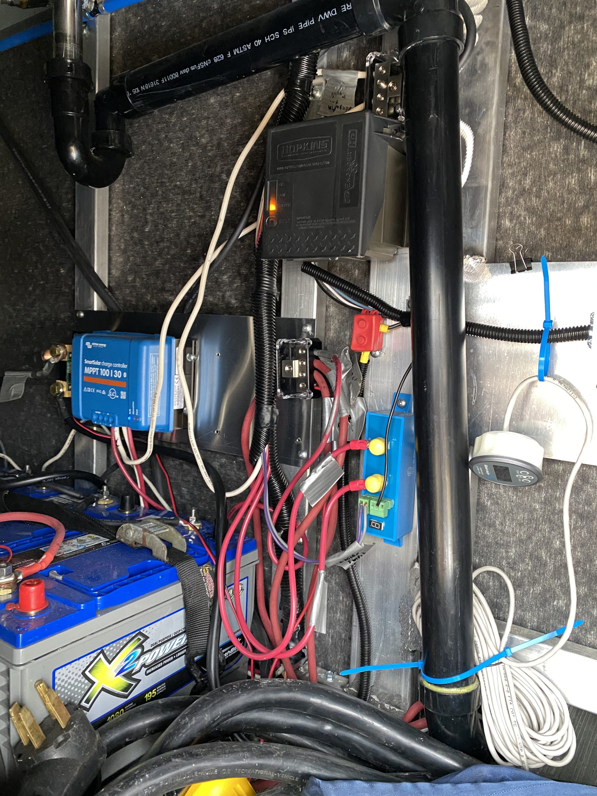Additions were to include my 700 watt solar package and a Color Control GX inside the RV for the display, control and data logging. I was able to use the midnite circuit breakers on both solar charge controllers in the same baby box. I didn’t like the way the inverter was mounted with wood so that would get secured better. I like to mount the sensitive electronics above the water lines as it is too easy for a small leak to form and take them out. The 6ga wires going into the inverter are critical to make sure there is no loss of voltage. There are better choices than the stereo grade buss bars when looking for long lasting tight connections. The biggest issue, so I thought was the battery wiring, there was some 2ga and some 4ga completing the circuit and knowing the inverter could pull a continuous ~250A it all needed to be 4/0. Since I was redoing the wiring I also cleaned up the stock DC wiring that was left to accommodate most battery configurations by ATC.